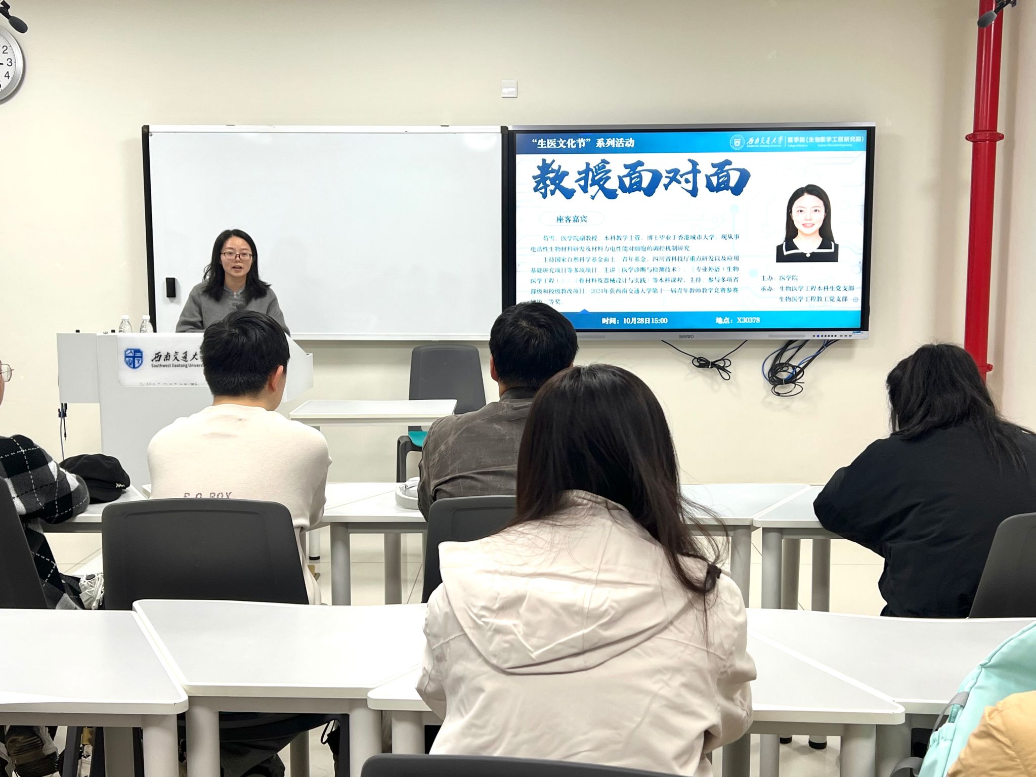 方向——电活性生物材料研发及其力电性能对细胞行为的调控机制,并向同学们介绍了自己目前主讲的课程信息,如《医学诊断与检测技术》、《专业外语(生物医学工程)》、《骨材料及器械设计与实践》等,帮助同学们更细致的了解专业特性与发展方向。