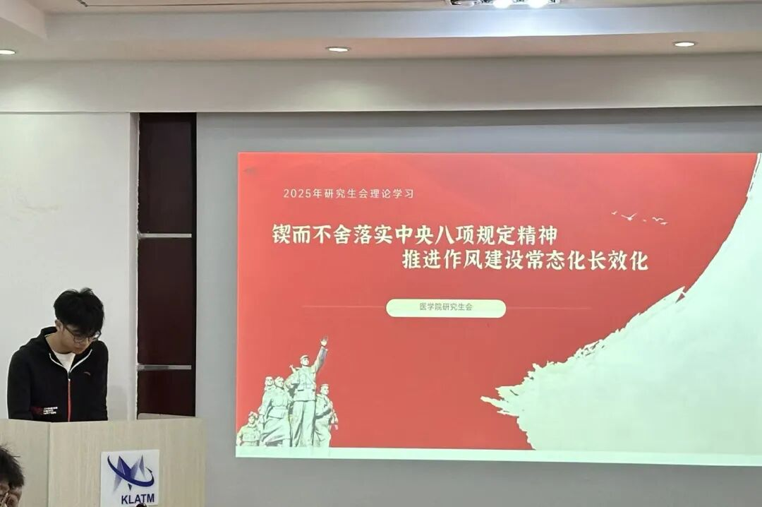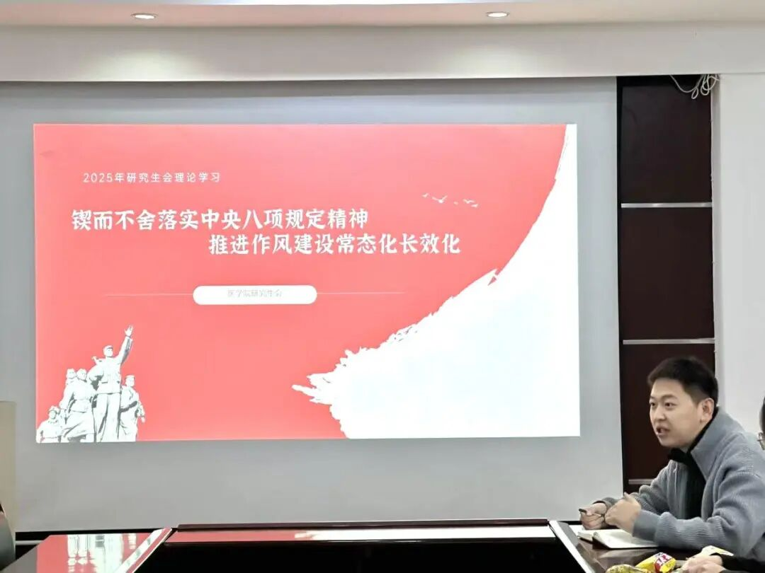 会议伊始,研会全体成员围绕“锲而不舍落实中央八项规定精神,推进作风建设常态化长效化”这一主题开展专题学习。学习过程中,大家充分结合校园生活共同回顾八项规定出台以来的会风学风变化,从中深刻认识到优良作风是研会发挥桥梁纽带作用、服务同学的根本保障。